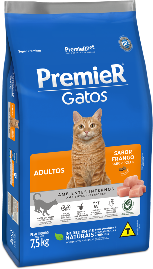 PremieR ofrece a su gato adulto una comida especial todos los días. Además de un sabor insuperable, proporciona una combinación única de ingredientes nobles que hacen que el pelaje sea mucho más hermoso y brillante. Para la salud del tracto urinario, PremieR Gatos Adultos – Pollo acidifica naturalmente la orina, controlando la formación de cálculos urinarios no deseados. PremieR Gatos Adultos – Pollo también tiene una poderosa acción anti-tártaro, proporcionando una excelente salud bucal.