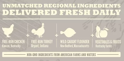 Pollo de corral en libertad, pavo y huevos del nido son entregados frescos de las granjas locales en proporciones de presaentera para nutrir a tu perro naturalmente sin una larga lista de ingredientes sintéticos. frutas y vegetales frescos cosechados localmente añaden un gran sabor y calidad.
